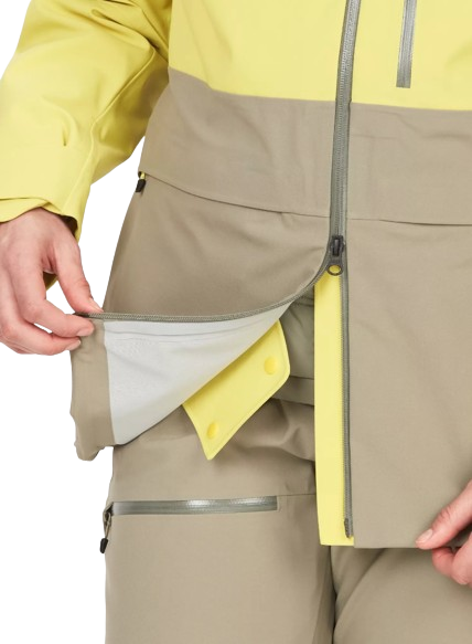 • Fixed powder skirt sits inside your jacket and hugs your waist to keep snow out and ensures your mid and base layers stay dry even when exploring deep powder