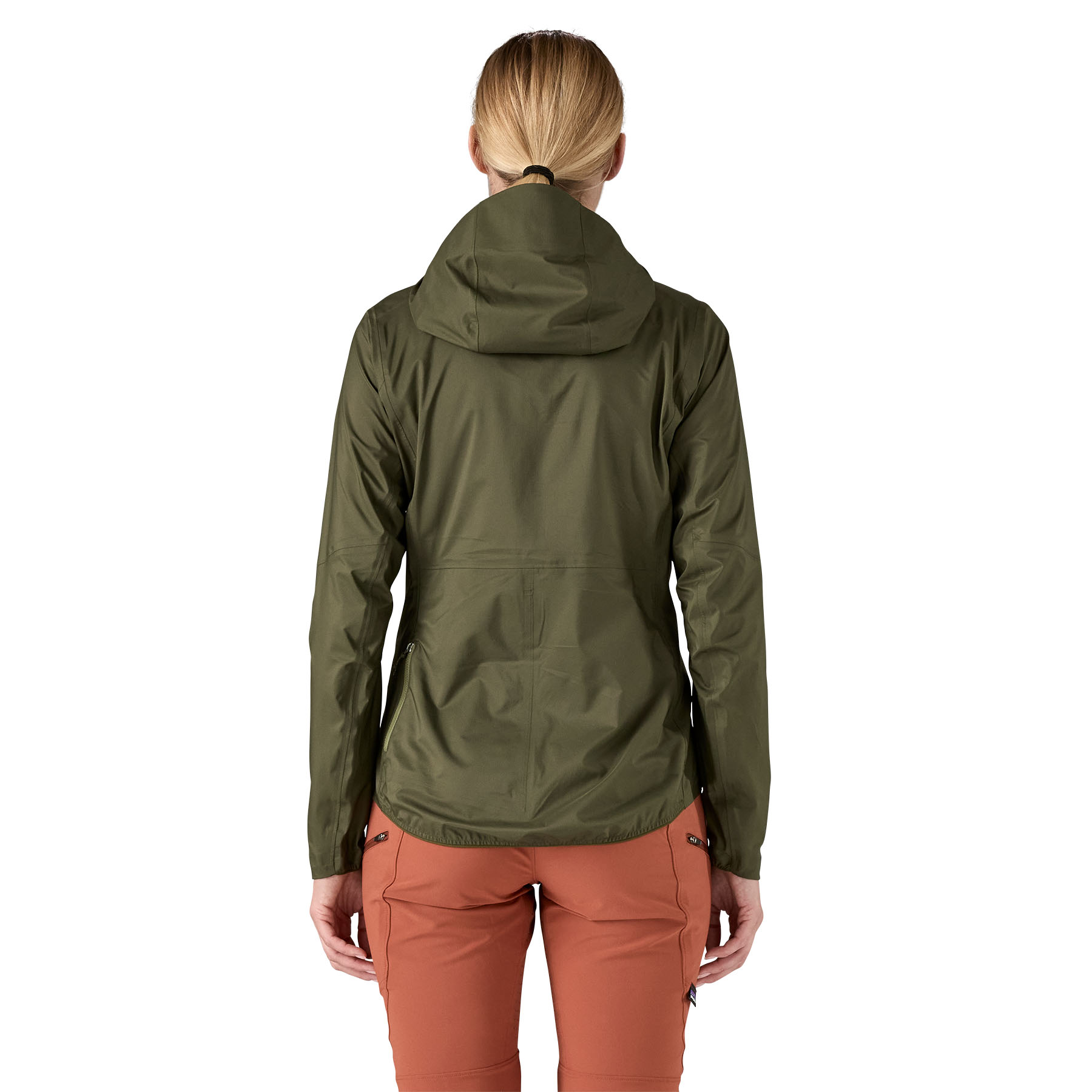 Jacket packs into secure rear pocket, or can be rolled into cinch hood and tied around the waist with jacket arms