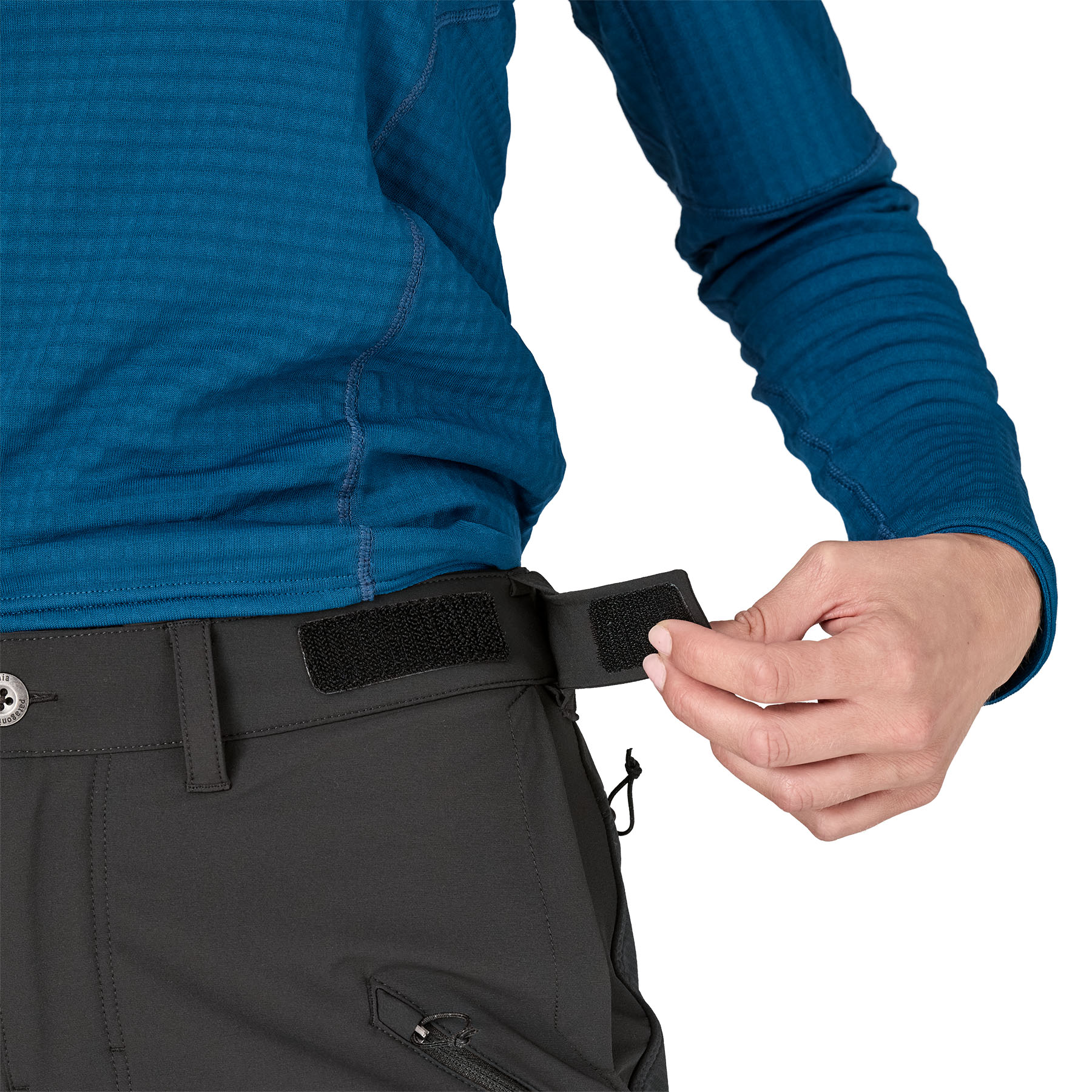 Waist and cuffs adjust with hook-and-loop tabs