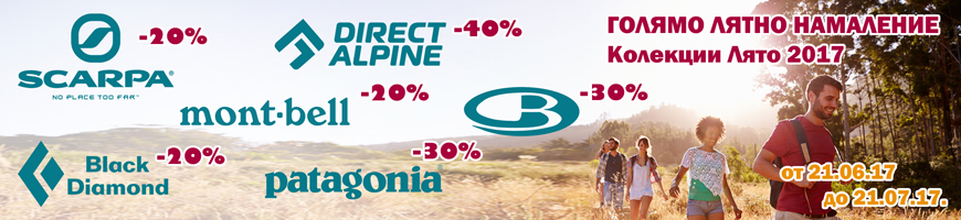 Честито лято, приятели! В магазини Basecamp празнуваме като даваме старт на Голямото лятно намаление! Летните колекции за 2017 на любими марки, сега на страхотни цени! SCARPA -20%, MontbellJP -20%, Directalpine -40%, Patagonia -30%, Patagonia Fly Fish -30%, Black Diamond -20%! Екипировката, която ще направи приключенията ви в топлите дни по-сигурни, приятни и усмихнати! Така започваме лятото и ви очакваме на адрес Черни връх 90, Стамболийски 46.