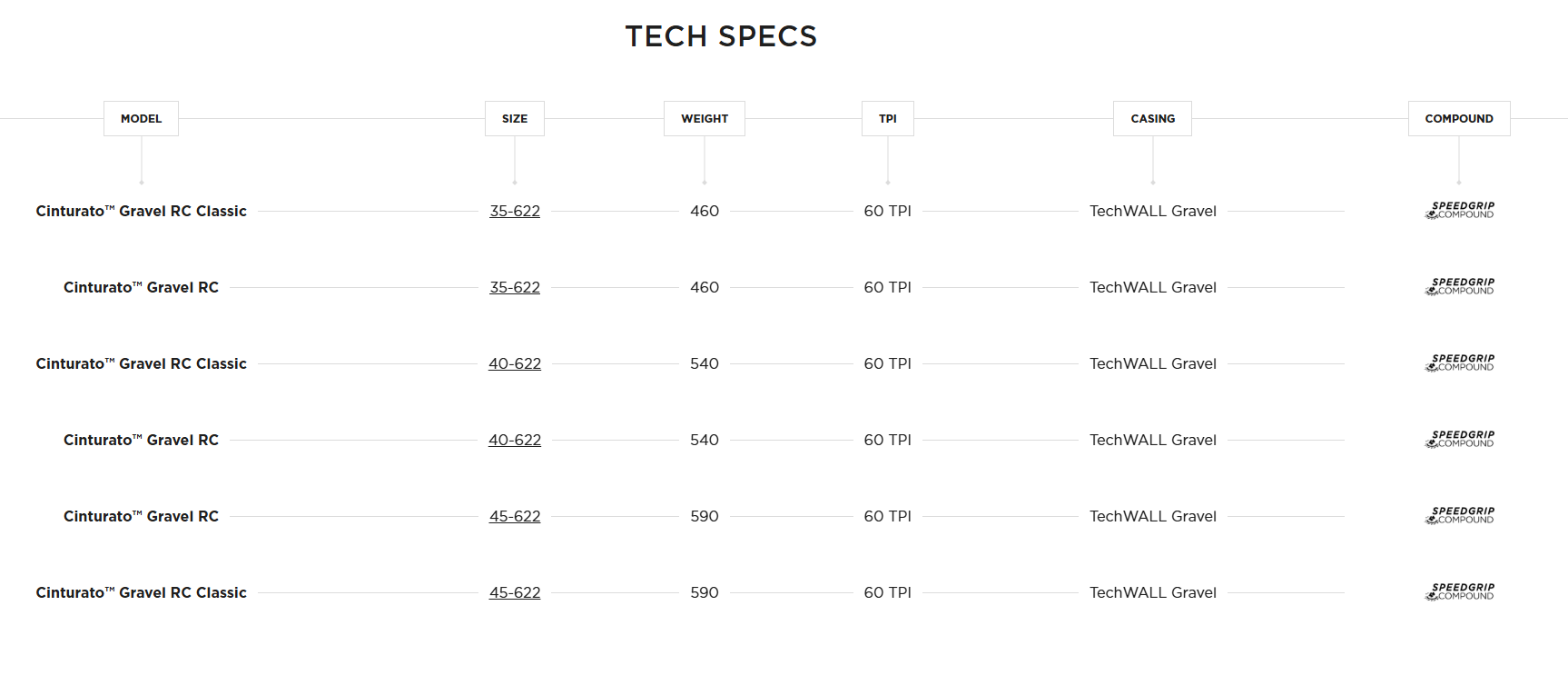 С прогресивен специфичен дизайн, извлечен от емблематичния Scorpion XC RC, Cinturato Gravel RC е отговорът на всички тези изисквания за Гравел състезания: бърз по правите, благодарение на минимални централни линии, и агресивен в завоите, с по-високи и по-значителни грайфери за подпомагане на управлението при завиване. Отличаващ се с безкамерна конструкция на корпуса TechWALL, той се предлага с подсилена и устойчива на срязване тъкан от 60 tpi заедно със защитен слой.