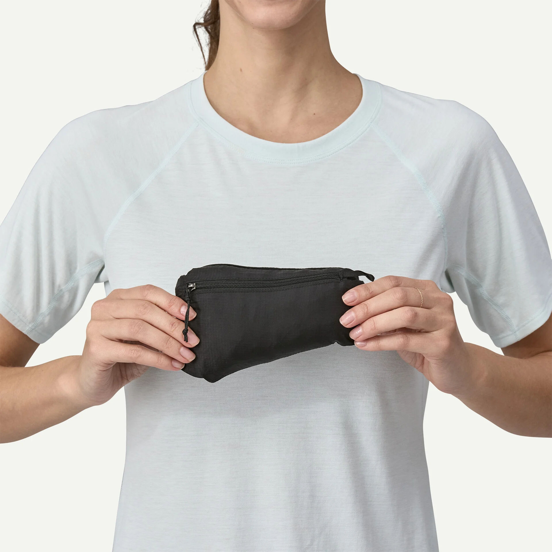 Zippered chest pocket converts to stuffsack with a reinforced carabiner clip-in loop