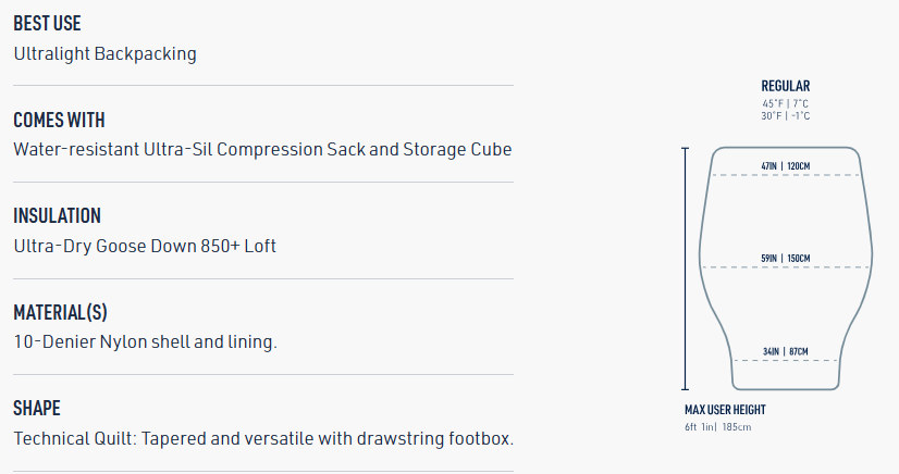 - Construction 7°C: Sewn-through construction. Drawcord in the foot section. Open up to a quilt or cinch tightly to create a ‘foot pocket’. -1°C: Vertical chest baffles, horizontal baffles lower half, box wall baffle construction throughout.